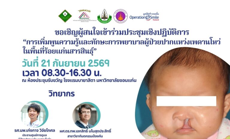 ขอเชิญเข้าร่วมประชุมเชิงปฏิบัติการ“การเพิ่มพูนความรู้และทักษะการพยาบาลผู้ป่วยปากแหว่งเพดานโหว่ในพื้นที่ร้อยแก่นสารสินธุ์”