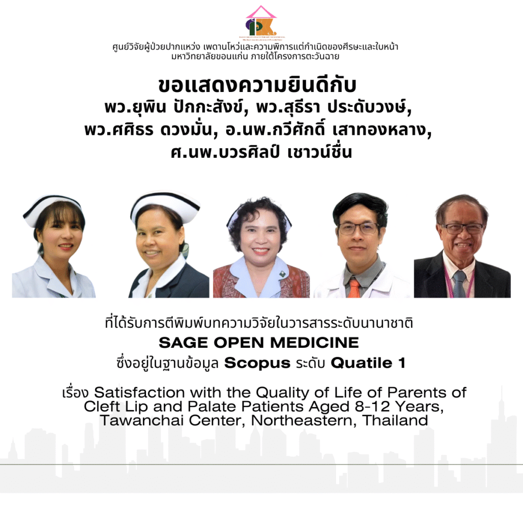 ที่ได้รับการตีพิมพ์บทความวิจัยในวารสารระดับนานาชาติ SAGE OPEN MEDICINE ซึ่งอยู่ในฐานข้อมูล Scopus ระดับ Quatile 1 เรื่อง Satisfaction with the Quality of Life of Parents of Cleft Lip and Palate Patients Aged 8-12 Years, Tawanchai Center, Northeastern, Thailand
