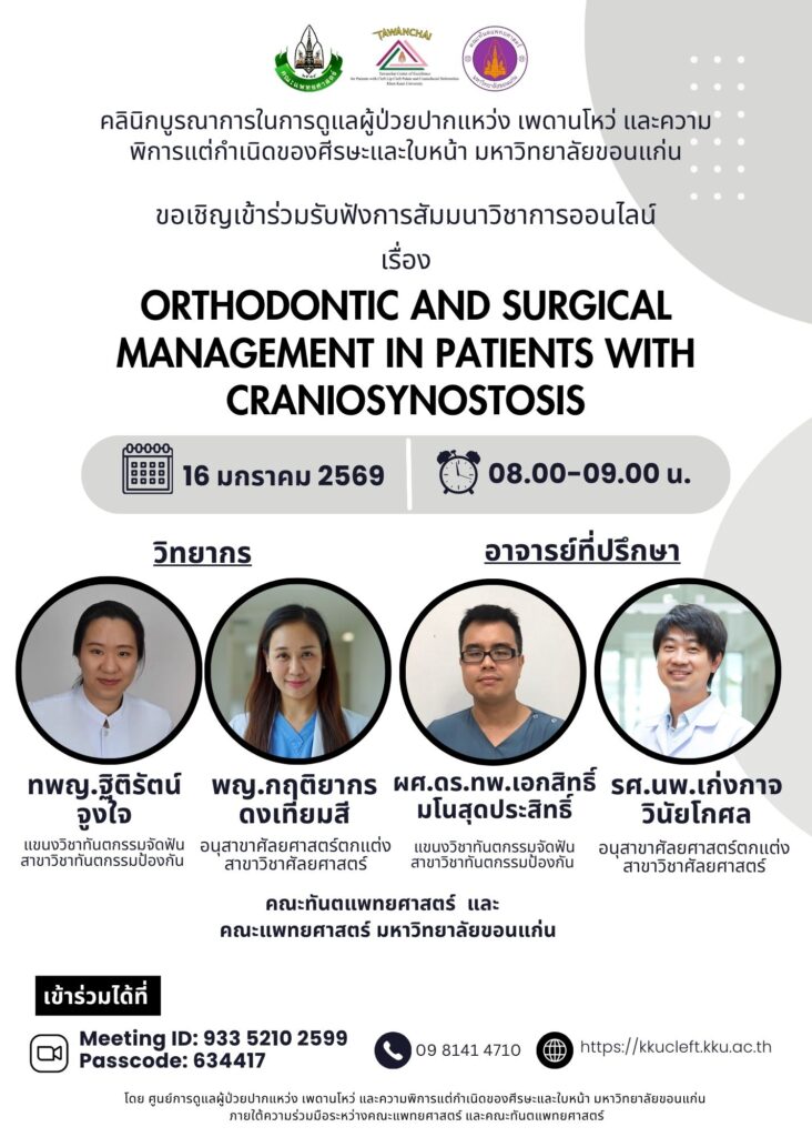 ขอเชิญท่านเข้าร่วมรับฟังการสัมมนาวิชาการออนไลน์ เรื่อง Orthodontic and surgical management in patients with Craniosynostosis ในวันศุกร์ที่ 16 มกราคม 2569 เวลา 08.00-09.00 น. ผ่านโปรแกรม ZOOM Meeting
