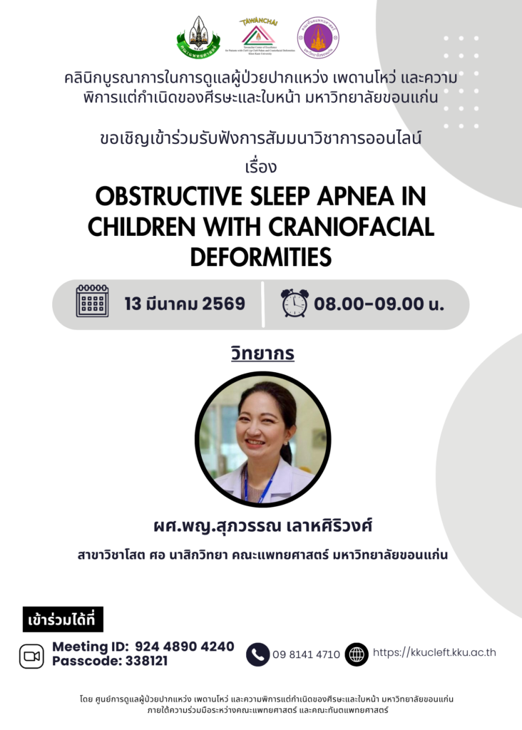 ขอเชิญท่านเข้าร่วมรับฟังการสัมมนาวิชาการออนไลน์ เรื่อง Obstructive sleep apnea in children with craniofacial deformities ในวันศุกร์ที่ 13 มีนาคม 2569 เวลา 08.00-09.00 น. ผ่านโปรแกรม ZOOM Meeting