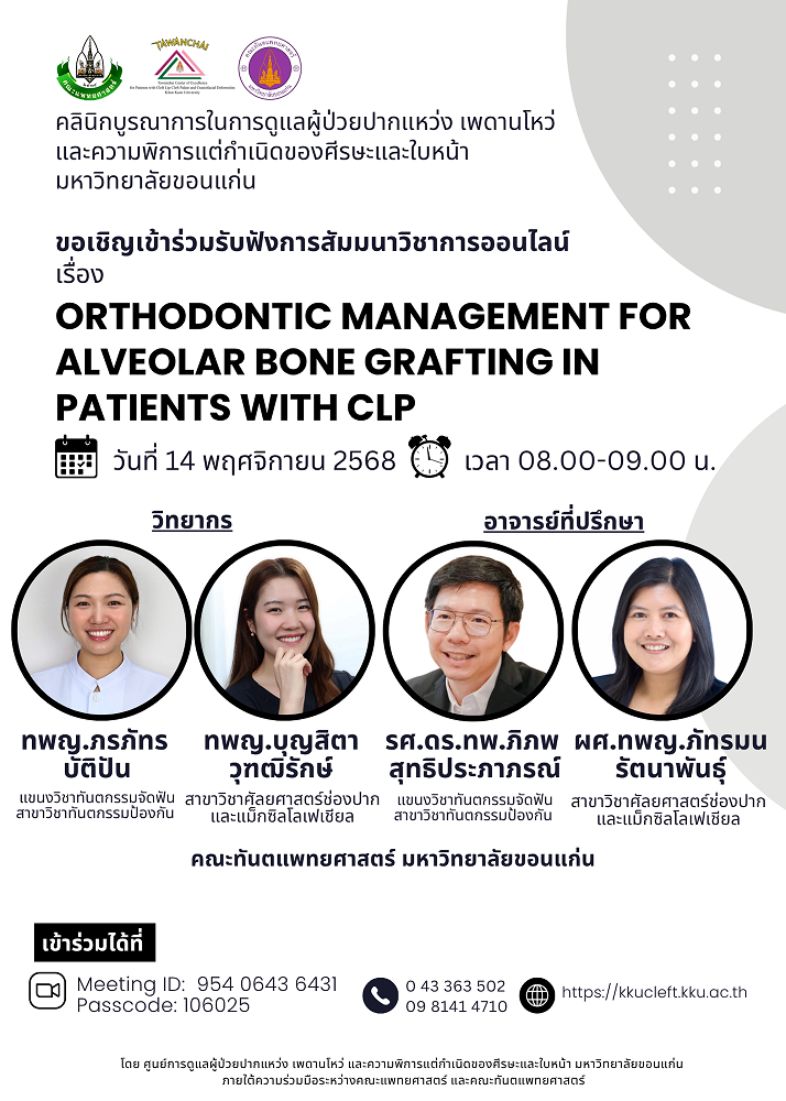 ขอเชิญเข้าร่วมรับฟังการสัมมนาวิชาการออนไลน์ เรื่อง Orthodontic management for alveolar bone grafting in patients with CLP