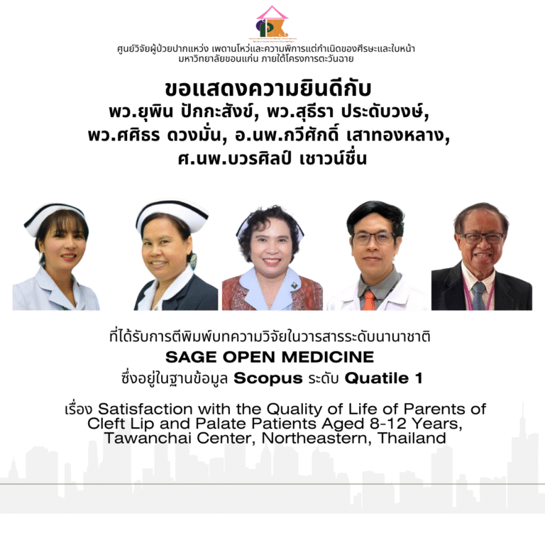 Princessศูนย์ตะวันฉายTawanchai Cleft CenterPrincessศูนย์ตะวันฉายTawanchai Cleft Center ศูนย์การดูแลผู้ป่วยปากแหว่ง เพดานโหว่ฯ ศูนย์วิจัยผู้ป่วยปากแหว่ง เพดานโหว่ฯ มูลนิธิตะวันฉายฯ Tawanchai Cleft Center Visitor Timeline ข่าวและกิจกรรม ศูนย์การดูแลผู้ป่วยปากแหว่ง เพดานโหว่ฯ ขอเชิญเข้าร่วมรับฟังการสัมมนาวิชาการออนไลน์ เรื่อง Orthodontic management for alveolar bone grafting in patients with CLPศูนย์ตะวันฉายเข้าร่วมประชุมวิชาการประจำปี 2568 สมาคมความพิการปากแหว่ง เพดานโหว่ ใบหน้าและศีรษะแห่งประเทศไทยทีมศูนย์ตะวันฉาย ถ่ายทอดผลงานวิจัยด้านการรักษาผู้ปากแหว่งเพดานโหว่ ในงานประชุม CLEFT 2025 Kyoto, Japanน้อมรำลึกพระมหากรุณาธิคุณ สมเด็จพระพันปีหลวง More > ข่าวและกิจกรรม ศูนย์วิจัยผู้ป่วยปากแหว่ง เพดานโหว่ฯ พว.ยุพิน ปักกะสังข์ พร้อมคณะวิจัย ได้รับการตีพิมพ์บทความวิจัยในวารสารระดับนานาชาติ Q1นักศึกษาระดับบัณฑิตศึกษาและอาจารย์คณะทันตแพทยศาสตร์ มหาวิทยาลัยขอนแก่น ตีพิมพ์บทความวิจัยในวารสารระดับนานาชาติ Q1ขอแสดงความยินดีกับ รศ.พญ.กมลวรรณ เจนวิถีสุข ที่ได้รับการแต่งตั้งเป็นศาสตราจารย์ศ.ดร.เบญจมาศ พระธานี พร้อมคณะวิจัย ได้รับการตีพิมพ์บทความวิจัยในวารสารระดับนานาชาติ Q2 More >